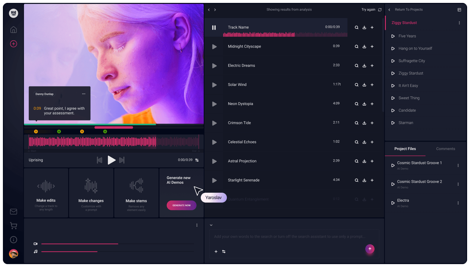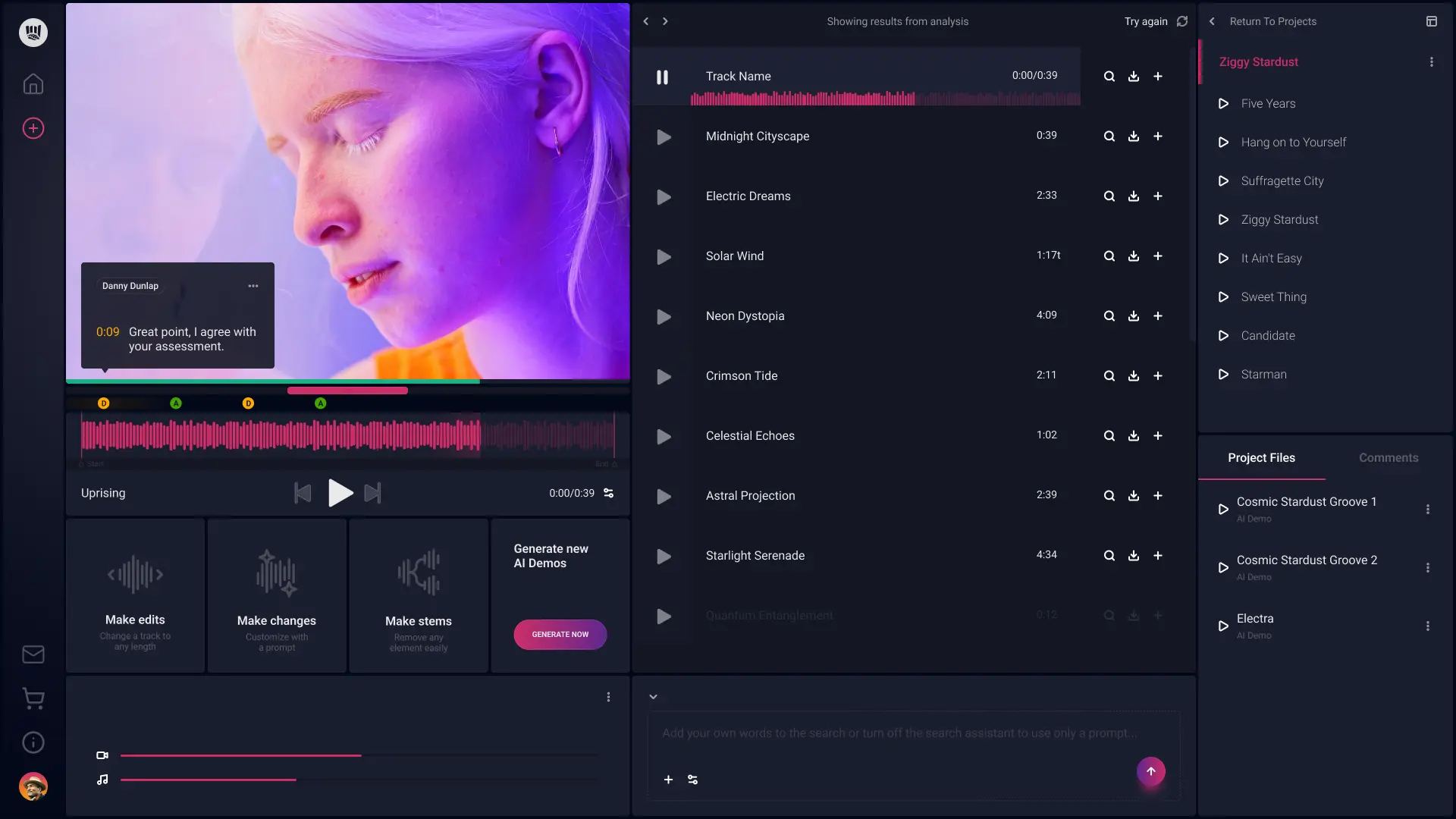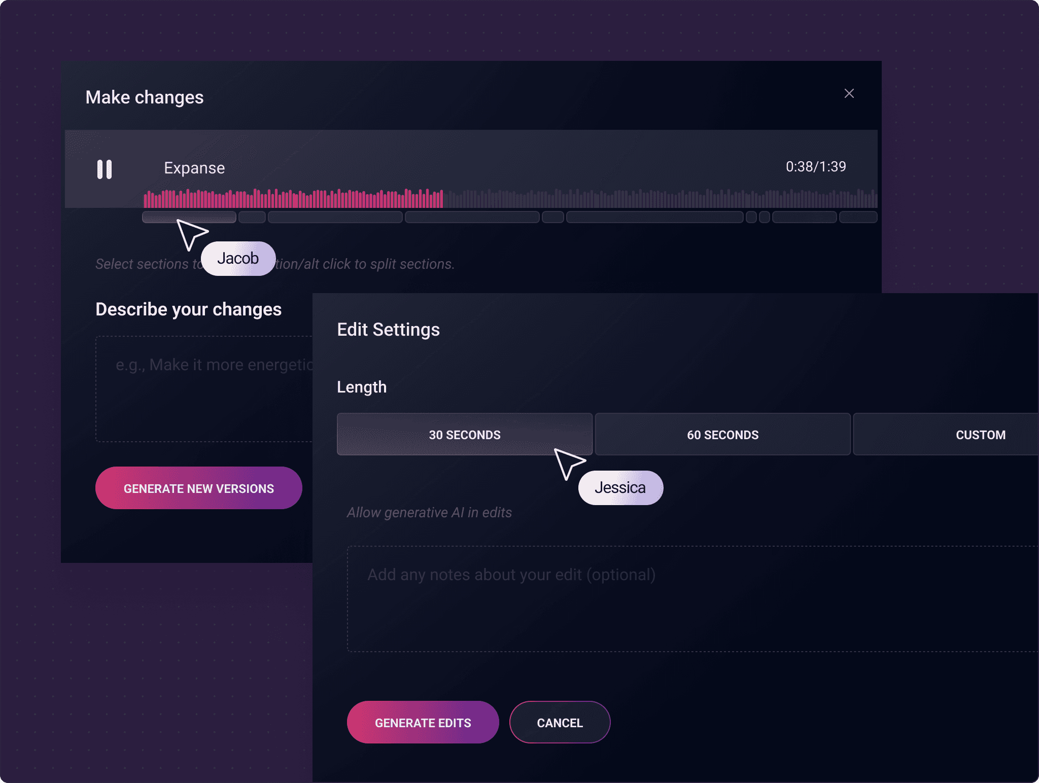 • Make Edits automatically adjusts a track's structure to match your video's timing - creating custom edits in a click. • Make Changes lets you transform specific sections of a track using ethically trained generative music AI. Select the portion you want to modify, describe what you want (e.g., "make it more energetic with faster drums"), and we'll generate new versions while keeping the rest intact.