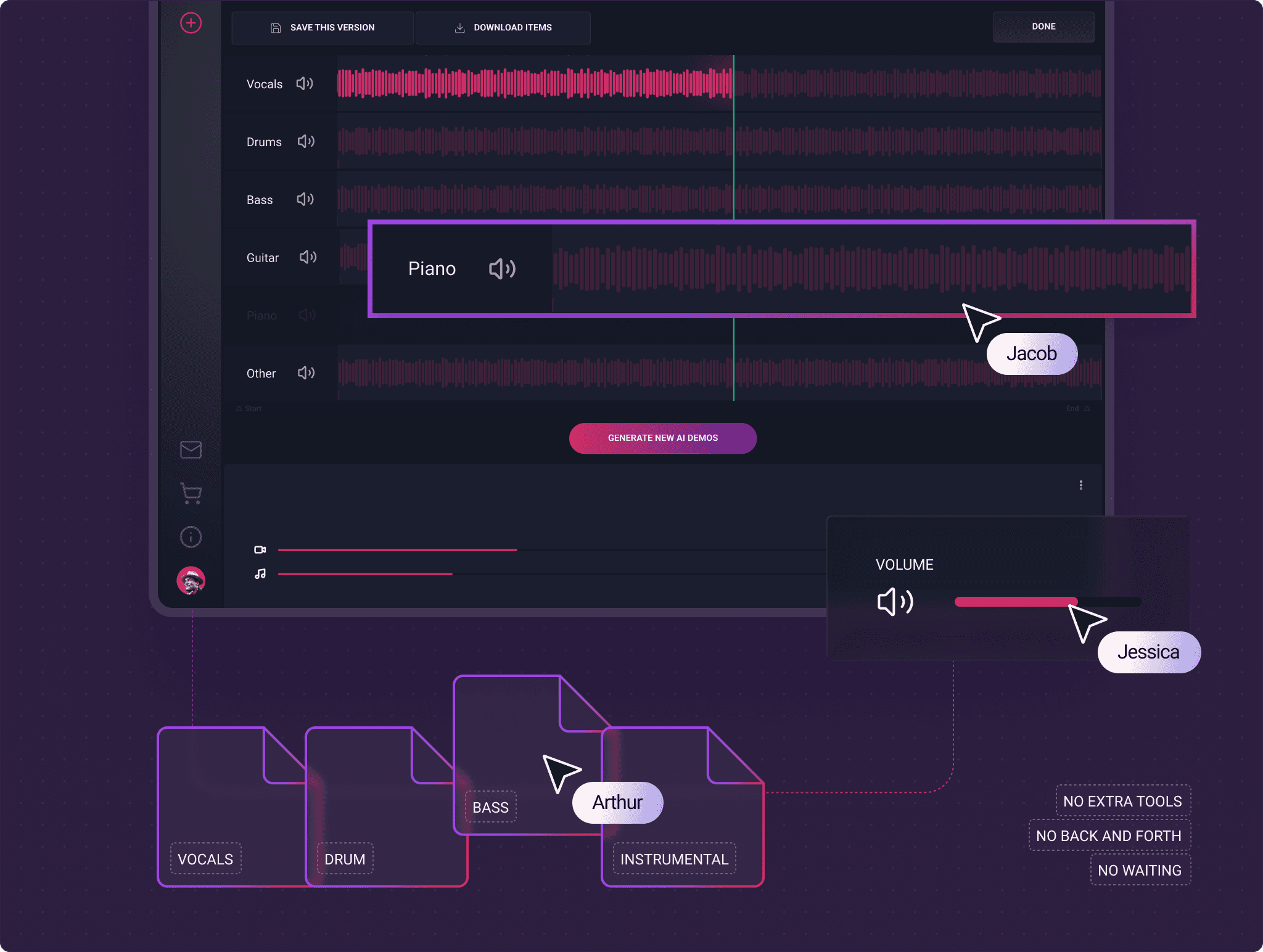 Yes! Our Stems feature separates any track into individual components (vocals, drums, bass, guitar, piano, and other). You can adjust the volume of each stem or mute instruments entirely, then save your custom mix as a new version.